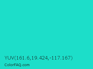 YUV 161.6,19.424,-117.167 Color is a normal cyan color and the nearest color is Turquoise PWG #30d5c8. Hex code #1cdec9 and RGB value is rgb(28,222,201). In RGB color space, this color is composed of 11% red, 87% green, 79% blue, In CMYK color space, this color is composed of 87% cyan, 0% magenta, 9% yellow , 13% black , In HSL color space, this color has a hue angle of 174° , 78% saturation and 49% lightness.