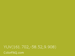 YUV 161.702,-58.52,9.908 Color is a normal yellow color and the nearest color is Citron #9fa91f. Hex code #adb32b and RGB value is rgb(173,179,43). In RGB color space, this color is composed of 68% red, 70% green, 17% blue, In CMYK color space, this color is composed of 3% cyan, 0% magenta, 76% yellow , 30% black , In HSL color space, this color has a hue angle of 63° , 61% saturation and 44% lightness.