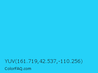 YUV 161.719,42.537,-110.256 Color is a normal cyan color and the nearest color is Spiro Disco Ball #0fc0fc. Hex code #24d1f8 and RGB value is rgb(36,209,248). In RGB color space, this color is composed of 14% red, 82% green, 97% blue, In CMYK color space, this color is composed of 85% cyan, 16% magenta, 0% yellow , 3% black , In HSL color space, this color has a hue angle of 191° , 94% saturation and 56% lightness.