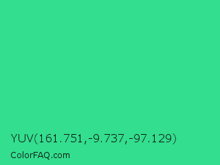 YUV 161.751,-9.737,-97.129 Color is a normal green color and the nearest color is Shamrock #33cc99. Hex code #33de8e and RGB value is rgb(51,222,142). In RGB color space, this color is composed of 20% red, 87% green, 56% blue, In CMYK color space, this color is composed of 77% cyan, 0% magenta, 36% yellow , 13% black , In HSL color space, this color has a hue angle of 152° , 72% saturation and 54% lightness.