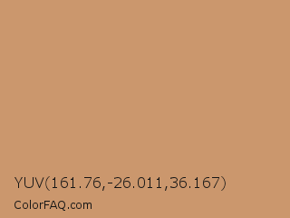 YUV 161.76,-26.011,36.167 Color is a light orange color and the nearest color is Brown Yellow #cc9966. Hex code #cb976d and RGB value is rgb(203,151,109). In RGB color space, this color is composed of 80% red, 59% green, 43% blue, In CMYK color space, this color is composed of 0% cyan, 26% magenta, 46% yellow , 20% black , In HSL color space, this color has a hue angle of 27° , 47% saturation and 61% lightness.