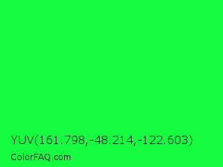 YUV 161.798,-48.214,-122.603 Color is a normal green color and the nearest color is Malachite #0bda51. Hex code #16fc40 and RGB value is rgb(22,252,64). In RGB color space, this color is composed of 9% red, 99% green, 25% blue, In CMYK color space, this color is composed of 91% cyan, 0% magenta, 75% yellow , 1% black , In HSL color space, this color has a hue angle of 131° , 97% saturation and 54% lightness.
