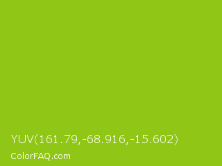 YUV 161.79,-68.916,-15.602 Color is a normal lime color and the nearest color is Pistachio Green #9dc209. Hex code #90c616 and RGB value is rgb(144,198,22). In RGB color space, this color is composed of 56% red, 78% green, 9% blue, In CMYK color space, this color is composed of 27% cyan, 0% magenta, 89% yellow , 22% black , In HSL color space, this color has a hue angle of 78° , 80% saturation and 43% lightness.