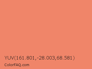 YUV 161.801,-28.003,68.581 Color is a light red color and the nearest color is Salmon #fa8072. Hex code #f08569 and RGB value is rgb(240,133,105). In RGB color space, this color is composed of 94% red, 52% green, 41% blue, In CMYK color space, this color is composed of 0% cyan, 45% magenta, 56% yellow , 6% black , In HSL color space, this color has a hue angle of 12° , 82% saturation and 68% lightness.
