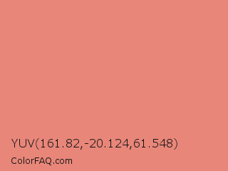 YUV 161.82,-20.124,61.548 Color is a light red color and the nearest color is Middle Red #e58e73. Hex code #e88679 and RGB value is rgb(232,134,121). In RGB color space, this color is composed of 91% red, 53% green, 47% blue, In CMYK color space, this color is composed of 0% cyan, 42% magenta, 48% yellow , 9% black , In HSL color space, this color has a hue angle of 7° , 71% saturation and 69% lightness.
