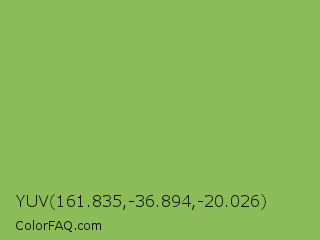 YUV 161.835,-36.894,-20.026 Color is a normal green color and the nearest color is Dollar Bill #85bb65. Hex code #8bbc57 and RGB value is rgb(139,188,87). In RGB color space, this color is composed of 55% red, 74% green, 34% blue, In CMYK color space, this color is composed of 26% cyan, 0% magenta, 54% yellow , 26% black , In HSL color space, this color has a hue angle of 89° , 43% saturation and 54% lightness.