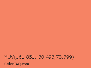 YUV 161.851,-30.493,73.799 Color is a light red color and the nearest color is Salmon #ff8c69. Hex code #f68364 and RGB value is rgb(246,131,100). In RGB color space, this color is composed of 96% red, 51% green, 39% blue, In CMYK color space, this color is composed of 0% cyan, 47% magenta, 59% yellow , 4% black , In HSL color space, this color has a hue angle of 13° , 89% saturation and 68% lightness.