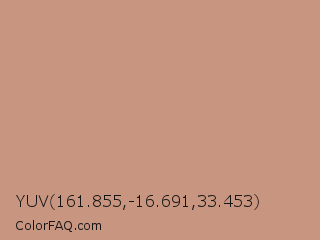 YUV 161.855,-16.691,33.453 Color is a light orange color and the nearest color is Antique Brass #cd9575. Hex code #c89580 and RGB value is rgb(200,149,128). In RGB color space, this color is composed of 78% red, 58% green, 50% blue, In CMYK color space, this color is composed of 0% cyan, 26% magenta, 36% yellow , 22% black , In HSL color space, this color has a hue angle of 18° , 40% saturation and 64% lightness.