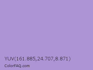YUV 161.885,24.707,8.871 Color is a light violet color and the nearest color is East Side #ac91ce. Hex code #ac93d4 and RGB value is rgb(172,147,212). In RGB color space, this color is composed of 67% red, 58% green, 83% blue, In CMYK color space, this color is composed of 19% cyan, 31% magenta, 0% yellow , 17% black , In HSL color space, this color has a hue angle of 263° , 43% saturation and 70% lightness.