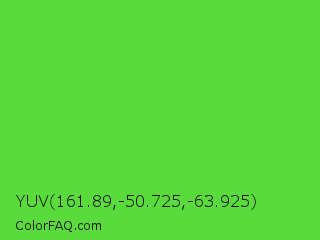 YUV 161.89,-50.725,-63.925 Color is a normal green color and the nearest color is Lime Green #32cd32. Hex code #59db3b and RGB value is rgb(89,219,59). In RGB color space, this color is composed of 35% red, 86% green, 23% blue, In CMYK color space, this color is composed of 59% cyan, 0% magenta, 73% yellow , 14% black , In HSL color space, this color has a hue angle of 109° , 69% saturation and 55% lightness.