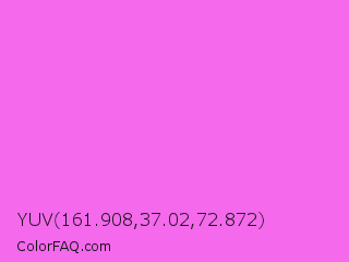 YUV 161.908,37.02,72.872 Color is a light magenta color and the nearest color is Pink Flamingo #fc74fd. Hex code #f569ed and RGB value is rgb(245,105,237). In RGB color space, this color is composed of 96% red, 41% green, 93% blue, In CMYK color space, this color is composed of 0% cyan, 57% magenta, 3% yellow , 4% black , In HSL color space, this color has a hue angle of 303° , 88% saturation and 69% lightness.