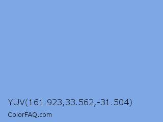YUV 161.923,33.562,-31.504 Color is a light blue color and the nearest color is Light Cobalt Blue #88ace0. Hex code #7ea7e6 and RGB value is rgb(126,167,230). In RGB color space, this color is composed of 49% red, 65% green, 90% blue, In CMYK color space, this color is composed of 45% cyan, 27% magenta, 0% yellow , 10% black , In HSL color space, this color has a hue angle of 216° , 68% saturation and 70% lightness.