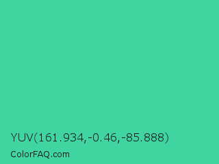 YUV 161.934,-0.46,-85.888 Color is a normal green color and the nearest color is Eucalyptus #44d7a8. Hex code #40d4a1 and RGB value is rgb(64,212,161). In RGB color space, this color is composed of 25% red, 83% green, 63% blue, In CMYK color space, this color is composed of 70% cyan, 0% magenta, 24% yellow , 17% black , In HSL color space, this color has a hue angle of 159° , 63% saturation and 54% lightness.