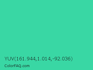 YUV 161.944,1.014,-92.036 Color is a normal green color and the nearest color is Eucalyptus #44d7a8. Hex code #39d7a4 and RGB value is rgb(57,215,164). In RGB color space, this color is composed of 22% red, 84% green, 64% blue, In CMYK color space, this color is composed of 73% cyan, 0% magenta, 24% yellow , 16% black , In HSL color space, this color has a hue angle of 161° , 66% saturation and 53% lightness.