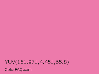YUV 161.971,4.451,65.8 Color is a light rose color and the nearest color is Carissma #ea88a8. Hex code #ed7aab and RGB value is rgb(237,122,171). In RGB color space, this color is composed of 93% red, 48% green, 67% blue, In CMYK color space, this color is composed of 0% cyan, 49% magenta, 28% yellow , 7% black , In HSL color space, this color has a hue angle of 334° , 76% saturation and 70% lightness.
