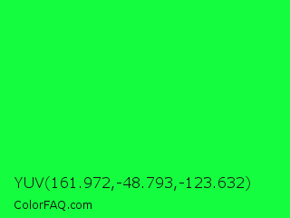 YUV 161.972,-48.793,-123.632 Color is a normal green color and the nearest color is Malachite #0bda51. Hex code #15fd3f and RGB value is rgb(21,253,63). In RGB color space, this color is composed of 8% red, 99% green, 25% blue, In CMYK color space, this color is composed of 92% cyan, 0% magenta, 75% yellow , 1% black , In HSL color space, this color has a hue angle of 131° , 98% saturation and 54% lightness.