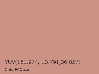 YUV 161.974,-13.791,36.857 Color is a light red color and the nearest color is My Pink #d69188. Hex code #cc9286 and RGB value is rgb(204,146,134). In RGB color space, this color is composed of 80% red, 57% green, 53% blue, In CMYK color space, this color is composed of 0% cyan, 28% magenta, 34% yellow , 20% black , In HSL color space, this color has a hue angle of 10° , 41% saturation and 66% lightness.