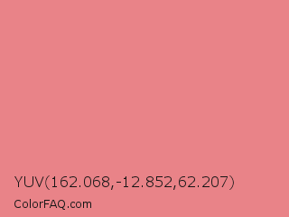 YUV 162.068,-12.852,62.207 Color is a light red color and the nearest color is Light Coral #f08080. Hex code #e98388 and RGB value is rgb(233,131,136). In RGB color space, this color is composed of 91% red, 51% green, 53% blue, In CMYK color space, this color is composed of 0% cyan, 44% magenta, 42% yellow , 9% black , In HSL color space, this color has a hue angle of 357° , 70% saturation and 71% lightness.