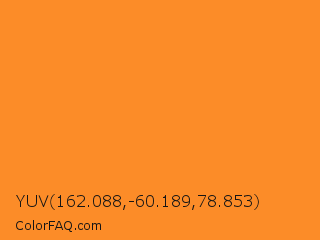 YUV 162.088,-60.189,78.853 Color is a normal orange color and the nearest color is Princeton Orange #f58025. Hex code #fc8c28 and RGB value is rgb(252,140,40). In RGB color space, this color is composed of 99% red, 55% green, 16% blue, In CMYK color space, this color is composed of 0% cyan, 44% magenta, 84% yellow , 1% black , In HSL color space, this color has a hue angle of 28° , 97% saturation and 57% lightness.