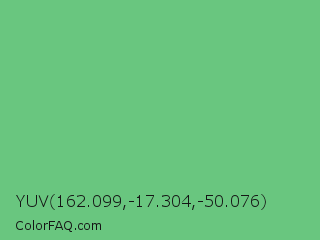 YUV 162.099,-17.304,-50.076 Color is a normal green color and the nearest color is Iguana Green #71bc78. Hex code #69c67f and RGB value is rgb(105,198,127). In RGB color space, this color is composed of 41% red, 78% green, 50% blue, In CMYK color space, this color is composed of 47% cyan, 0% magenta, 36% yellow , 22% black , In HSL color space, this color has a hue angle of 134° , 45% saturation and 59% lightness.