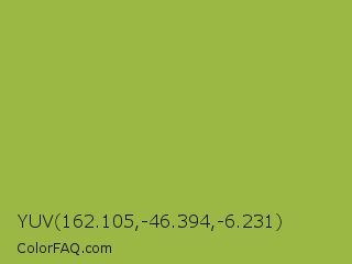 YUV 162.105,-46.394,-6.231 Color is a normal lime color and the nearest color is Android Green #a4c639. Hex code #9bb844 and RGB value is rgb(155,184,68). In RGB color space, this color is composed of 61% red, 72% green, 27% blue, In CMYK color space, this color is composed of 16% cyan, 0% magenta, 63% yellow , 28% black , In HSL color space, this color has a hue angle of 75° , 46% saturation and 49% lightness.