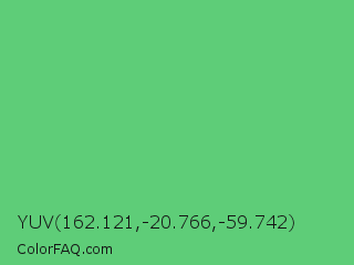 YUV 162.121,-20.766,-59.742 Color is a normal green color and the nearest color is Emerald #50c878. Hex code #5ecd78 and RGB value is rgb(94,205,120). In RGB color space, this color is composed of 37% red, 80% green, 47% blue, In CMYK color space, this color is composed of 54% cyan, 0% magenta, 41% yellow , 20% black , In HSL color space, this color has a hue angle of 134° , 53% saturation and 59% lightness.