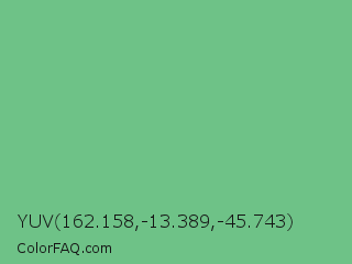 YUV 162.158,-13.389,-45.743 Color is a normal green color and the nearest color is De York #7ac488. Hex code #6ec287 and RGB value is rgb(110,194,135). In RGB color space, this color is composed of 43% red, 76% green, 53% blue, In CMYK color space, this color is composed of 43% cyan, 0% magenta, 30% yellow , 24% black , In HSL color space, this color has a hue angle of 138° , 41% saturation and 60% lightness.