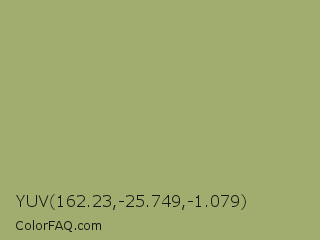 YUV 162.23,-25.749,-1.079 Color is a normal lime color and the nearest color is Green Smoke #a4af6e. Hex code #a1ad6e and RGB value is rgb(161,173,110). In RGB color space, this color is composed of 63% red, 68% green, 43% blue, In CMYK color space, this color is composed of 7% cyan, 0% magenta, 36% yellow , 32% black , In HSL color space, this color has a hue angle of 71° , 28% saturation and 55% lightness.