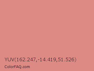 YUV 162.247,-14.419,51.526 Color is a light red color and the nearest color is My Pink #d69188. Hex code #dd8a85 and RGB value is rgb(221,138,133). In RGB color space, this color is composed of 87% red, 54% green, 52% blue, In CMYK color space, this color is composed of 0% cyan, 38% magenta, 40% yellow , 13% black , In HSL color space, this color has a hue angle of 3° , 56% saturation and 69% lightness.