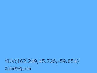 YUV 162.249,45.726,-59.854 Color is a light blue color and the nearest color is Blue Jeans #5dadec. Hex code #5eb3ff and RGB value is rgb(94,179,255). In RGB color space, this color is composed of 37% red, 70% green, 100% blue, In CMYK color space, this color is composed of 63% cyan, 30% magenta, 0% yellow , 0% black , In HSL color space, this color has a hue angle of 208° , 100% saturation and 68% lightness.