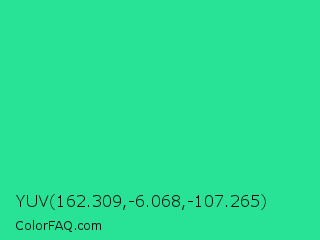 YUV 162.309,-6.068,-107.265 Color is a normal green color and the nearest color is Shamrock #33cc99. Hex code #28e396 and RGB value is rgb(40,227,150). In RGB color space, this color is composed of 16% red, 89% green, 59% blue, In CMYK color space, this color is composed of 82% cyan, 0% magenta, 34% yellow , 11% black , In HSL color space, this color has a hue angle of 155° , 77% saturation and 52% lightness.
