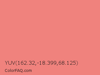 YUV 162.32,-18.399,68.125 Color is a light red color and the nearest color is Light Coral #f08080. Hex code #f0827d and RGB value is rgb(240,130,125). In RGB color space, this color is composed of 94% red, 51% green, 49% blue, In CMYK color space, this color is composed of 0% cyan, 46% magenta, 48% yellow , 6% black , In HSL color space, this color has a hue angle of 3° , 79% saturation and 72% lightness.