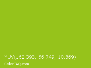 YUV 162.393,-66.749,-10.869 Color is a normal lime color and the nearest color is Pistachio Green #9dc209. Hex code #96c31b and RGB value is rgb(150,195,27). In RGB color space, this color is composed of 59% red, 76% green, 11% blue, In CMYK color space, this color is composed of 23% cyan, 0% magenta, 86% yellow , 24% black , In HSL color space, this color has a hue angle of 76° , 76% saturation and 44% lightness.