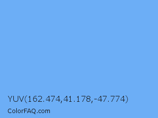 YUV 162.474,41.178,-47.774 Color is a light blue color and the nearest color is French Sky Blue #77b5fe. Hex code #6caef6 and RGB value is rgb(108,174,246). In RGB color space, this color is composed of 42% red, 68% green, 96% blue, In CMYK color space, this color is composed of 56% cyan, 29% magenta, 0% yellow , 4% black , In HSL color space, this color has a hue angle of 211° , 88% saturation and 69% lightness.