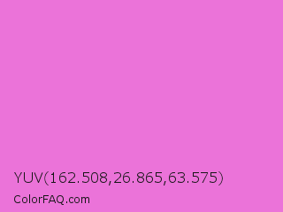 YUV 162.508,26.865,63.575 Color is a light magenta color and the nearest color is Orchid #da70d6. Hex code #eb73d9 and RGB value is rgb(235,115,217). In RGB color space, this color is composed of 92% red, 45% green, 85% blue, In CMYK color space, this color is composed of 0% cyan, 51% magenta, 8% yellow , 8% black , In HSL color space, this color has a hue angle of 309° , 75% saturation and 69% lightness.
