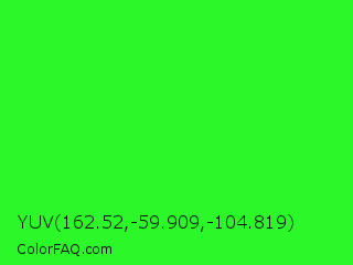 YUV 162.52,-59.909,-104.819 Color is a normal green color and the nearest color is Neon Green #39ff14. Hex code #2bf729 and RGB value is rgb(43,247,41). In RGB color space, this color is composed of 17% red, 97% green, 16% blue, In CMYK color space, this color is composed of 83% cyan, 0% magenta, 83% yellow , 3% black , In HSL color space, this color has a hue angle of 119° , 93% saturation and 56% lightness.