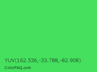 YUV 162.536,-33.788,-82.908 Color is a normal green color and the nearest color is UFO Green #3cd070. Hex code #44e05e and RGB value is rgb(68,224,94). In RGB color space, this color is composed of 27% red, 88% green, 37% blue, In CMYK color space, this color is composed of 70% cyan, 0% magenta, 58% yellow , 12% black , In HSL color space, this color has a hue angle of 130° , 72% saturation and 57% lightness.