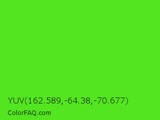 YUV 162.589,-64.38,-70.677 Color is a normal green color and the nearest color is Harlequin Green #46cb18. Hex code #52e520 and RGB value is rgb(82,229,32). In RGB color space, this color is composed of 32% red, 90% green, 13% blue, In CMYK color space, this color is composed of 64% cyan, 0% magenta, 86% yellow , 10% black , In HSL color space, this color has a hue angle of 105° , 79% saturation and 51% lightness.