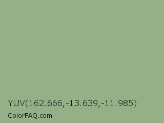 YUV 162.666,-13.639,-11.985 Color is a light green color and the nearest color is Sage #9ea587. Hex code #95af87 and RGB value is rgb(149,175,135). In RGB color space, this color is composed of 58% red, 69% green, 53% blue, In CMYK color space, this color is composed of 15% cyan, 0% magenta, 23% yellow , 31% black , In HSL color space, this color has a hue angle of 99° , 20% saturation and 61% lightness.