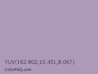 YUV 162.802,10.451,8.067 Color is a light purple color and the nearest color is Pastel Purple #b39eb5. Hex code #ac9ab8 and RGB value is rgb(172,154,184). In RGB color space, this color is composed of 67% red, 60% green, 72% blue, In CMYK color space, this color is composed of 7% cyan, 16% magenta, 0% yellow , 28% black , In HSL color space, this color has a hue angle of 276° , 17% saturation and 66% lightness.