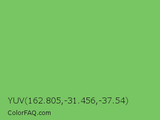 YUV 162.805,-31.456,-37.54 Color is a normal green color and the nearest color is Mantis #74c365. Hex code #78c563 and RGB value is rgb(120,197,99). In RGB color space, this color is composed of 47% red, 77% green, 39% blue, In CMYK color space, this color is composed of 39% cyan, 0% magenta, 50% yellow , 23% black , In HSL color space, this color has a hue angle of 107° , 46% saturation and 58% lightness.