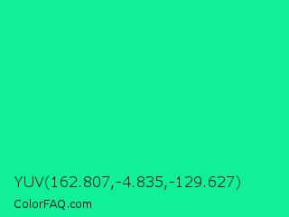 YUV 162.807,-4.835,-129.627 Color is a normal green color and the nearest color is Medium Spring Green #00fa9a. Hex code #0ff099 and RGB value is rgb(15,240,153). In RGB color space, this color is composed of 6% red, 94% green, 60% blue, In CMYK color space, this color is composed of 94% cyan, 0% magenta, 36% yellow , 6% black , In HSL color space, this color has a hue angle of 157° , 88% saturation and 50% lightness.