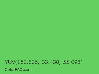 YUV 162.826,-33.438,-55.098 Color is a normal green color and the nearest color is Mantis #74c365. Hex code #64d05f and RGB value is rgb(100,208,95). In RGB color space, this color is composed of 39% red, 82% green, 37% blue, In CMYK color space, this color is composed of 52% cyan, 0% magenta, 54% yellow , 18% black , In HSL color space, this color has a hue angle of 117° , 55% saturation and 59% lightness.