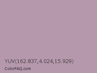 YUV 162.837,4.024,15.929 Color is a light magenta color and the nearest color is Lilac Luster #ae98aa. Hex code #b598ab and RGB value is rgb(181,152,171). In RGB color space, this color is composed of 71% red, 60% green, 67% blue, In CMYK color space, this color is composed of 0% cyan, 16% magenta, 6% yellow , 29% black , In HSL color space, this color has a hue angle of 321° , 16% saturation and 65% lightness.