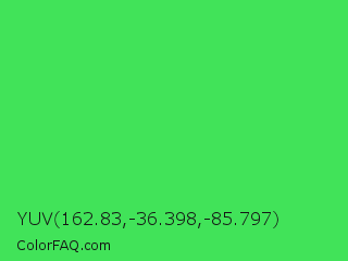 YUV 162.83,-36.398,-85.797 Color is a normal green color and the nearest color is UFO Green #3cd070. Hex code #41e359 and RGB value is rgb(65,227,89). In RGB color space, this color is composed of 25% red, 89% green, 35% blue, In CMYK color space, this color is composed of 71% cyan, 0% magenta, 61% yellow , 11% black , In HSL color space, this color has a hue angle of 129° , 74% saturation and 57% lightness.
