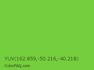 YUV 162.859,-50.216,-40.218 Color is a normal green color and the nearest color is Kiwi #8ee53f. Hex code #75ce3d and RGB value is rgb(117,206,61). In RGB color space, this color is composed of 46% red, 81% green, 24% blue, In CMYK color space, this color is composed of 43% cyan, 0% magenta, 70% yellow , 19% black , In HSL color space, this color has a hue angle of 97° , 60% saturation and 52% lightness.