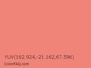 YUV 162.924,-21.162,67.596 Color is a light red color and the nearest color is Tea Rose #f88379. Hex code #f08478 and RGB value is rgb(240,132,120). In RGB color space, this color is composed of 94% red, 52% green, 47% blue, In CMYK color space, this color is composed of 0% cyan, 45% magenta, 50% yellow , 6% black , In HSL color space, this color has a hue angle of 6° , 80% saturation and 71% lightness.
