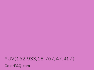 YUV 162.933,18.767,47.417 Color is a light magenta color and the nearest color is French Mauve #d473d4. Hex code #d980c9 and RGB value is rgb(217,128,201). In RGB color space, this color is composed of 85% red, 50% green, 79% blue, In CMYK color space, this color is composed of 0% cyan, 41% magenta, 7% yellow , 15% black , In HSL color space, this color has a hue angle of 311° , 54% saturation and 68% lightness.