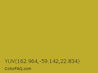 YUV 162.964,-59.142,22.834 Color is a normal yellow color and the nearest color is Hokey Pokey #c8a528. Hex code #bdad2b and RGB value is rgb(189,173,43). In RGB color space, this color is composed of 74% red, 68% green, 17% blue, In CMYK color space, this color is composed of 0% cyan, 8% magenta, 77% yellow , 26% black , In HSL color space, this color has a hue angle of 53° , 63% saturation and 45% lightness.