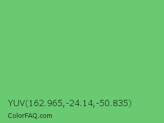 YUV 162.965,-24.14,-50.835 Color is a normal green color and the nearest color is Iguana Green #71bc78. Hex code #69ca72 and RGB value is rgb(105,202,114). In RGB color space, this color is composed of 41% red, 79% green, 45% blue, In CMYK color space, this color is composed of 48% cyan, 0% magenta, 44% yellow , 21% black , In HSL color space, this color has a hue angle of 126° , 48% saturation and 60% lightness.